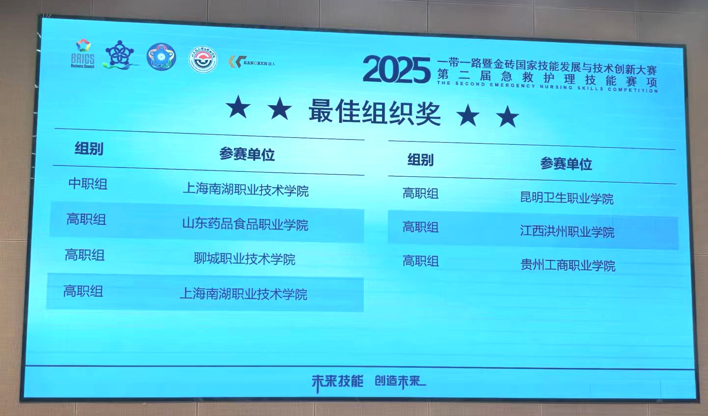 11月11日至14日,2025“一带一路”暨金砖国家技能发展与技术创新大赛第二届急救护理技能赛项决赛在山东威海圆满落幕。上海南湖职业技术学院健康护理系选派的中职、高职两组参赛队伍,从全国91所院校的120余支队伍中脱颖而出,双双斩获一等奖,指导教师团队获评“优秀指导教师”,学院荣获“最佳组织奖”,以亮眼成绩彰显我院护理专业人才培养实力。